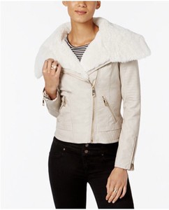 Guess ladies short faux leather moto jacket with removable faux fur collar and lace detail on sleeve cuffs.